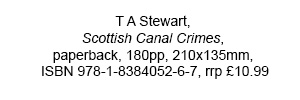 SCOTTISH CANAL CRIMES: The year is 1835, and two strangers on the murky banks of the Union Canal make boatmaster James Ross a proposition. They will give him a pound in return for an alibi. Should anyone ask, they have been aboard his vessel all night. Ross glimpses their mud-spattered shoes. What have they been doing? A century later, Dalmuir couple Edith and Charles Hunter set off on a wintry evening walk along the Forth and Clyde. Minutes later cries of distress are heard from the banks, but the Hunters have gone. A police search soon becomes a sensational murder case. Scotland’s major canals, from the Highlands to the Lowlands, all feature in the annals of crime. In this fascinating new history T.A. Stewart reveals how assailants and thieves, and even kidnappers and terrorists, have been drawn to the waterways to practise their black arts. T A STEWART is a journalist and historian who has worked as a news reporter, features writer and music critic on a number of newspapers in Central Scotland, including The Herald. She was also a researcher and tutor for a period at Glasgow Caledonian University. Her primary area of interest is the social history of crime in the nineteenth and early twentieth centuries.