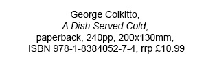 A DISH SERVED COLD takes Scottish author Geoirge Colkitto back to his home town of Paisley. An enthralling tartan noir based on the theme of revenge, it is set not only in Paisley but other locations on the west coast of Scotland. GEORGE COLKITTO is an ex-Inspector of Taxes, chartered accountant and bookshop owner. He writes both poetry and prose and has had short stories and poetry published in magazines and anthologies including Ink Sweat and Tears, Envoi and Poetry Scotland. He was delighted to be in the St Magnus International Festival 2016 Anniversary Programme. Successful in a number of competitions including Pendle War Poetry 2018, he is a past winner of the Scottish Writers’ Groups Short Story Competition 2011 and Poetry Competition 2012, the Siar Sceal Hanna Greally Poetry Award 2014, and the Autumn Voices Acrostic Competition 2020. He is author of the Sebastian Symes series of Victorian Detective novellas, featuring Sebastian Symes and Major Ritson, contemporaries of Sherlock Holmes. This is his first full-length detective novel.