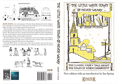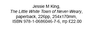 JESSIE MARION KING Jessie Marion King (20 March 1875–3 August 1949) was a Scottish artist, designer and illustrator especially known for her illustrated books. She was one of the artists known as the Glasgow Girls. Little known at the time of her death, her work is now widely admired and celebrated. THE LITTLE WHITE TOWN OF NEVER WEARY by Jessie M King was published in 1917. It has been out of copyright since 2018. This new edition with a comprehensive introduction by Ian Spring is released to coincide with the 150th anniversary of her birth on 20th March 2025. The Little White Town consists of a description of a small town, clearly based on Kirkcudbright where King lived at the time, in the form of a sort of fairy tale for children. Although King had illustrated and designed many books, she was not accustomed to writing the text by herself and this proved somewhat daunting for her. Her primary idea had been to include with the book cardboard cutouts of buildings in the town which could be constructed and decorated by children — and she worked on this with her daughter Merle, who was eight at the time. The date of release of the book is significant as simple toys for children were necessitated by the ravages of war. It was also a time, of course, when many children had suffered from the loss of their fathers. The book was also intended as a tribute to Kirkcudbright, where King had happily settled with her husband and daughter. The ‘Little White Town’, is in some ways idyllic, but not perfect, and it can be seen as an example of a small town that demonstrates to a child the various functions of a typical community. Although the book cannot be regarded as part of a wider Scottish fictional tradition per se, it could be regarded as an antidote to the ‘anti-kailyard’ school of fiction, typified by, for example, The House with the Green Shutters and Gillespie, that portrays Scottish small town life as insular, gossipy, treacherous and far from idyllic.